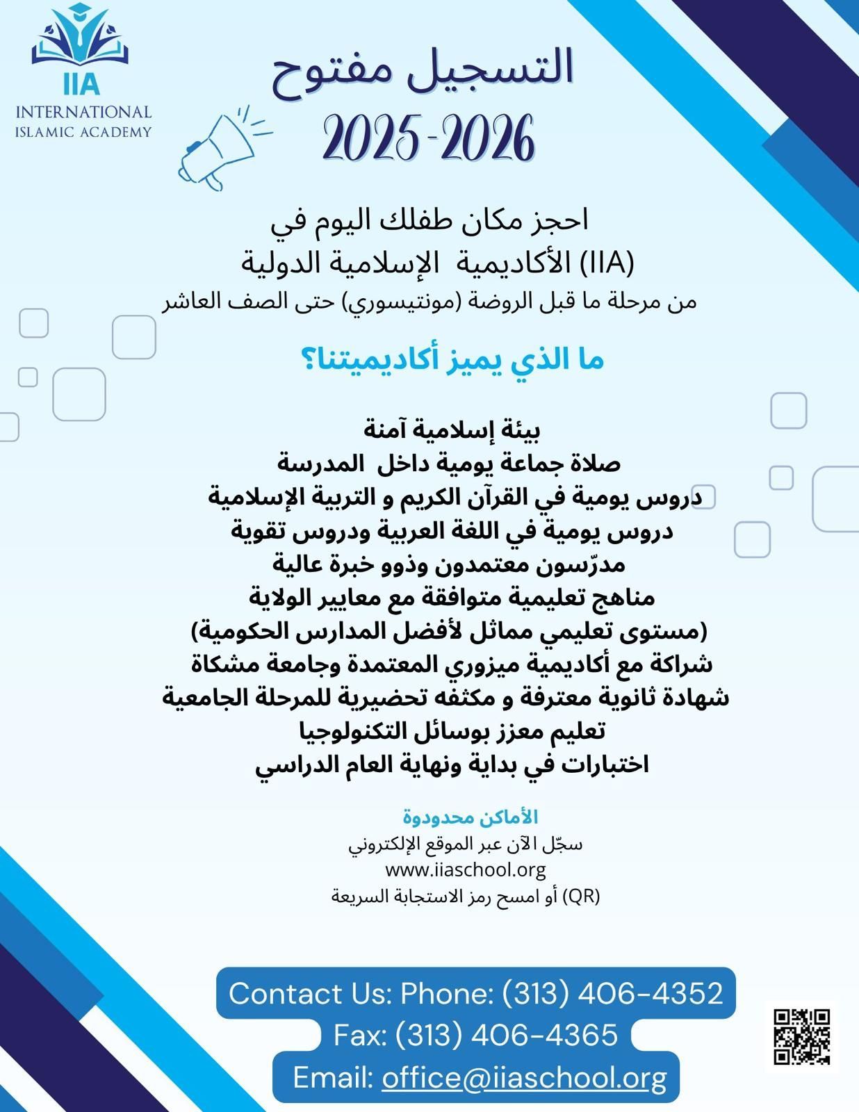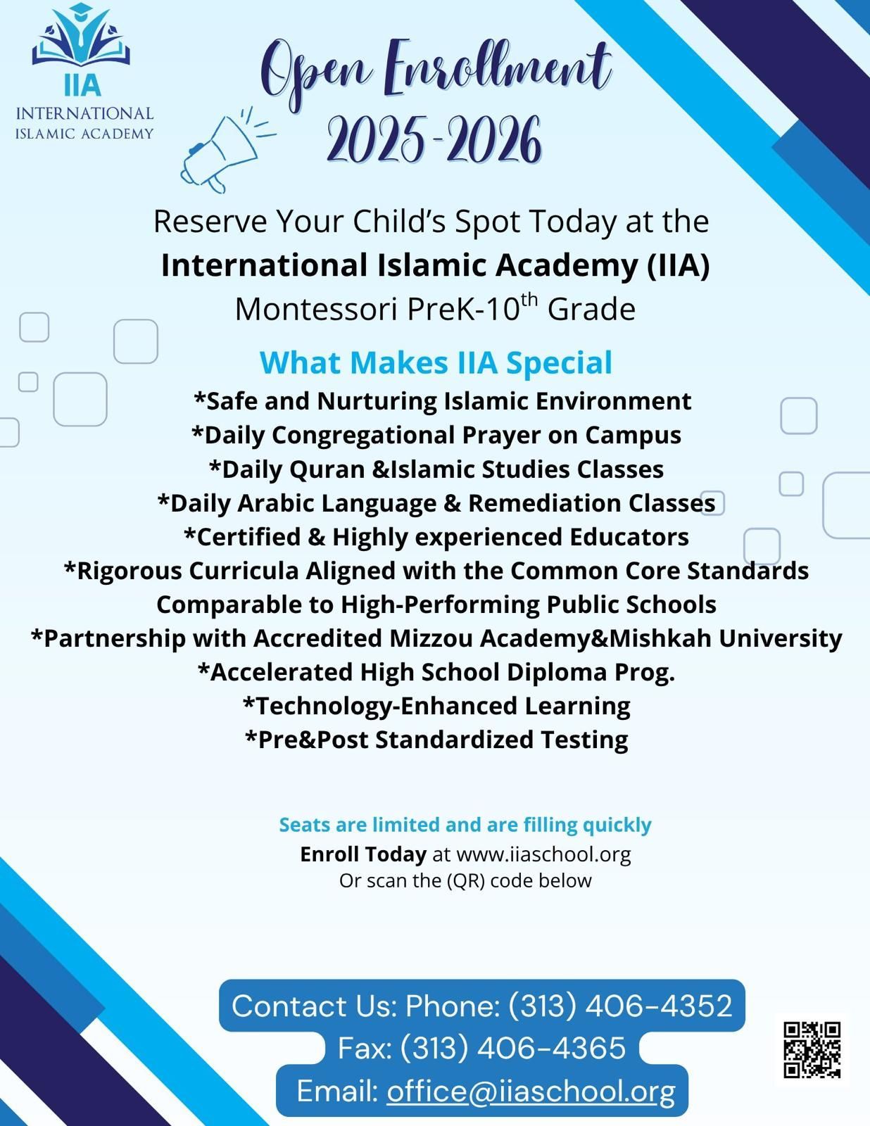In 1990 Dar Al Arqam school was established. Then in 2011, Dar Alarqam School and Al Ihsan Academy merged to create a new entity, International Islamic Academy (IIA). IIA is dedicated to excellence in education, morals, and ethical values. It provides a rich and challenging curriculum, fulfilling the requirements of the State of Michigan. In addition, it offers opportunities for intellectual and personal growth, instilling in students an appreciation for the treasures, beauty, and richness of an outstanding Arabic, Qur’an, and Islamic Studies education. IIA endeavors to provide a profound understanding of Islam, preparing highly academic scholars, citizens, and community builders. IIA’s mission is to enable students to achieve their academic best, fostering lifelong learning, responsibility, and leadership for every individual.